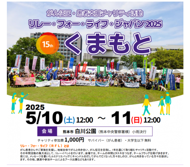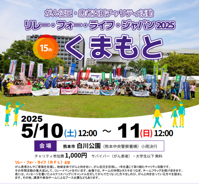 『リレー・フォー・ライフ(RFL)』は「がん患者さんとご家族を支援するチャリティイベント」です。世界34か国2460か所で行われていて、日本では全国48か所で1年を通して行われます。日本で行われる『リレー・フォー・ライフ』の最初のスタートを切るのが熊本です。今年は、5月10‐11日(土日)に、熊本市中央区の白川公園にて開催されます。